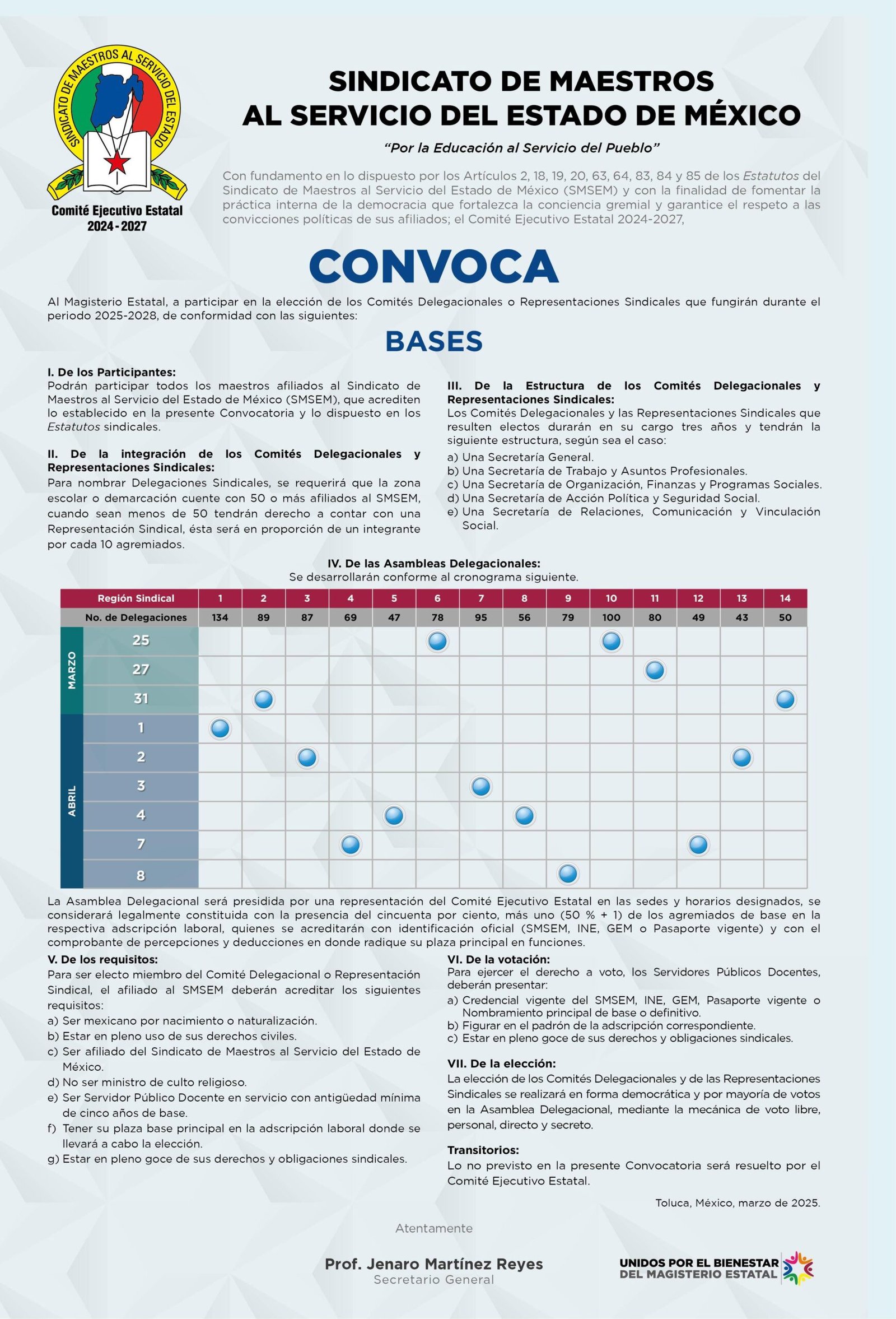 Las Asambleas Delegacionales serán el espacio donde las y los docentes afiliados ejercerán su derecho a votar y ser votados, garantizando un proceso democrático y transparente. Para ello, cada Asamblea será presidida por una representación del Comité Ejecutivo Estatal y deberá contar con la asistencia del 50% más uno de los docentes de base adscritos a cada centro de trabajo. Éstas se llevarán a cabo del 25 de marzo al 8 de abril, de acuerdo con el siguiente calendario: