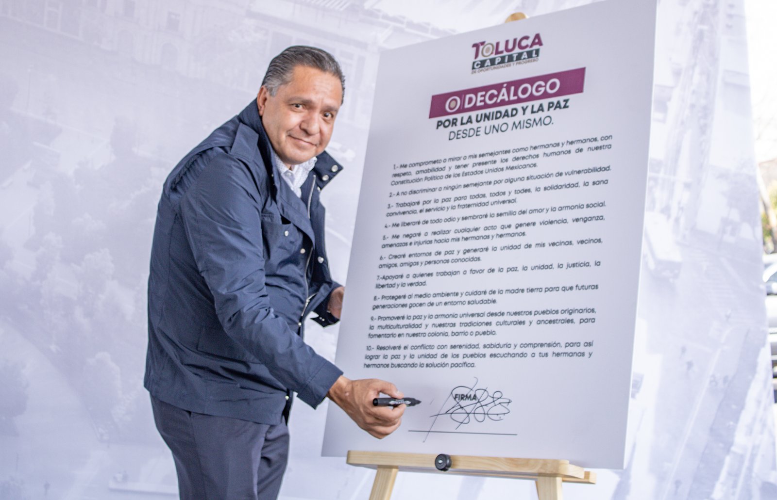 Toluca, EDOMEX.- El Presidente Municipal de Toluca, Ricardo Moreno Bastida, presentó el Decálogo por la Unidad y la Paz como un primer paso para consolidar la paz en la capital mexiquense.