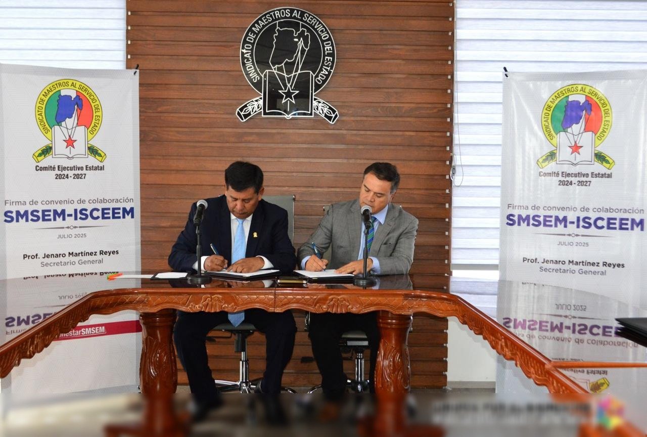 La firma estuvo encabezada por Jenaro Martínez Reyes, Secretario General del SMSEM, acompañado por Bernardo Martínez García, director del ISCEEM, quienes destacaron el valor de esta alianza que permitirá emprender acciones conjuntas en materia de formación docente, investigación, educación continua y acompañamiento académico para maestras y maestros afiliados.