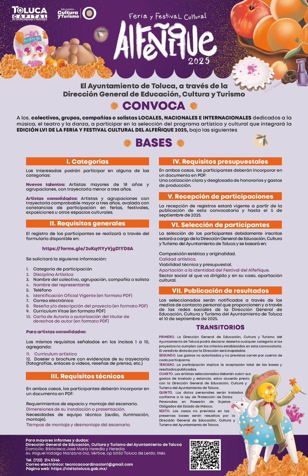 Cada uno de los interesados tienen hasta el 5 de septiembre para registrarse a través del formulario disponible en: https://forms.gle/2uKq91YyVjgD1YD8A donde se solicitará la información necesaria a los artistas: nuevos talentos que sean mayores de 18 años y agrupaciones con trayectoria menor a tres años; y consolidados con trayectoria comprobable mayor a tres años, avalada por constancias de participación en ferias, festivales, exposiciones u otros espacios culturales. Para conocer la convocatoria completa y todas las actividades preparadas para esta celebración, la población puede seguir las redes sociales oficiales del Ayuntamiento.