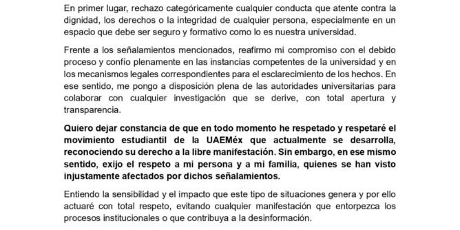 Asimismo, manifestó su reconocimiento al derecho a la libre expresión del movimiento estudiantil que actualmente se desarrolla en la UAEMéx, pero pidió que esta legítima movilización no se traduzca en hostigamiento ni en juicios anticipados que comprometan su honor ni el de su familia.