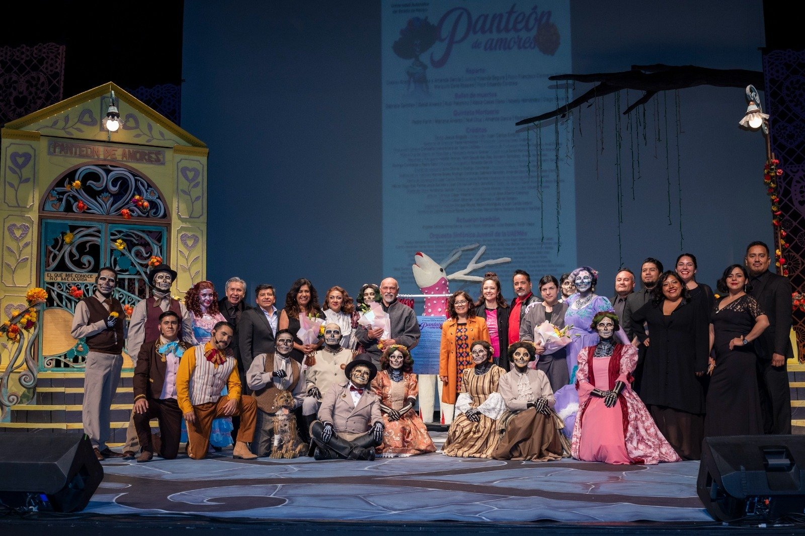 Toluca, EDOMEX.-  Panteón de Amores, puesta en escena de la Universidad Autónoma del Estado de México (UAEMéx) conmemorativa al Día de Muertos, concluyó su temporada 2025 y celebró su presentación número 50, en el Teatro Morelos de la capital mexiquense, donde se dieron cita la rectora Martha Patricia Zarza Delgado, el escritor Jesús Angulo y el director Juan Carlos Embriz Gonzaga.