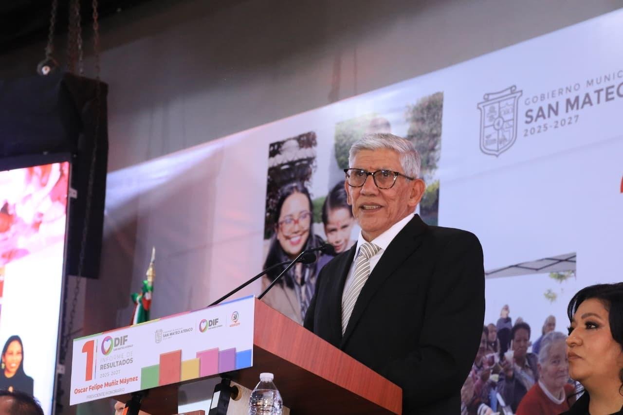 San Mateo Atenco, Estado de México, 27 de noviembre de 2025.- Con un mensaje centrado en la consolidación de una política social humana, incluyente y cercana a las familias, el presidente honorario del DIF San Mateo Atenco, Óscar Felipe Muñiz Máynez, presentó su Primer Informe de Resultados, destacando avances clave en infraestructura social, atención a grupos vulnerables y fortalecimiento institucional.