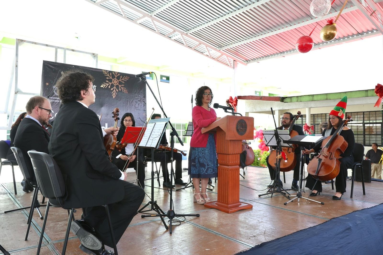 Almoloya de Alquisiras, Méx. – 27 de noviembre de 2025. La rectora de la Universidad Autónoma del Estado de México (UAEMéx), Martha Patricia Zarza Delgado, encabezó el primer concierto de navidad de la institución, a cargo de la Orquesta de Cámara, que se llevó a cabo en el Plantel “Mtro. José Ignacio Pichardo Pagaza” de la Escuela Preparatoria y que tiene como propósito fortalecer la identidad universitaria y acercar la cultura a espacios académicos y la sociedad en general.