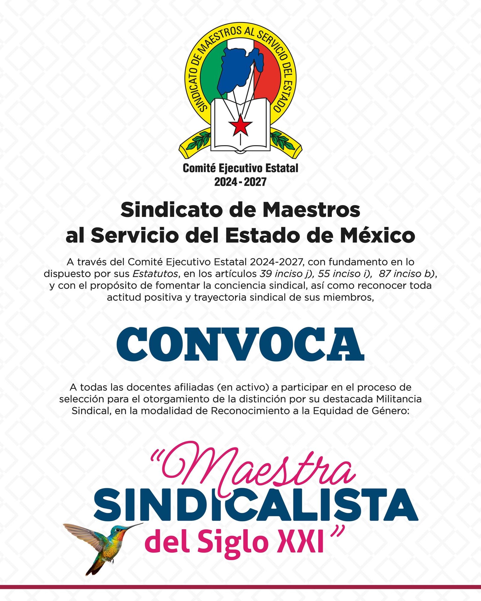 Este reconocimiento forma parte de las acciones del SMSEM para impulsar la equidad de género y destacar la participación activa de las mujeres en el ámbito sindical. Las maestras que resulten galardonadas recibirán una medalla conmemorativa, un reconocimiento institucional y un estímulo económico.